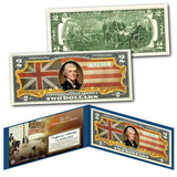 This GRAND UNION FLAG uncirculated $2 Bill is Genuine Authentic Legal Tender of the United States, which has been enhanced with beautiful colorized images. The Grand Union Flag (also known as the Continental Colors, the Congress Flag, the Cambridge Flag, and the First Navy Ensign), was the United States' first national flag. It was created during the first year of the Revolutionary War. The designer and exact date of creation are unknown, but it was an important signal that indicated increasing separation from the British. The full colorized images are accomplished through a revolutionary new authentic & genuine colorization process pioneered by The Merrick Mint, creating a collectible work of art. Each bill comes displayed in a blue folio with a Certificate of Authenticity to guarantee that your bills are authentic and recognized by every monetary authority around the world, therefore assuring its Collector Edition status. Each $2 Bill is in FRESH, CRISP, UNCIRCULATED condition, and was directly removed from untouched wrapped Federal Reserve sealed packs. Former U.S. President Thomas Jefferson is featured on the obverse of the note, along with the special colorization overlay. The Signing of the Declaration of Independence by John Trumbull is featured on the reverse. It is the only U.S. Currency note that features two Presidents, John Adams and Thomas Jefferson, and it is one of the most rarely seen BILLS in circulation and actual use.