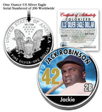 The officially licensed JACKIE ROBINSON colorized 2006 U.S. Silver Eagle Dollar coin is genuine legal tender struck by the U.S. Mint. It is minted in one full ounce of .999 PURE SILVER and measures a massive 40.6mm in diameter. This brilliant uncirculated silver dollar has been enhanced by a unique colorization process. Each coin is a limited edition and serial numbered of 206 on the coin reverse. Each coin comes in a premium coin capsule with a Certificate of Authenticity. Due to the age of the coin, there may be some toning which is a natural effect of .999 Pure Silver coins.