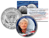 Janet Yellen is the 15th Chairman of the Federal Reserve, making her the 1st Woman Fed Chair in 100-Year History and head of the central banking system of the United States. Here is your opportunity to own or to gift, a beautifully colorized JFK Kennedy Half Dollar U.S. Coin. This Legal Tender United States coin has been colorized with an application of special inks directly to the surface of the coin, using a unique and painstakingly multicolor coin process, which achieves a level of detail, color saturation, and durability that is #1 in the coin industry. The result is an everlasting colorized coin collectible of ultra-high quality. Each coin comes in a premium coin capsule with a full color Certificate of Authenticity. The Kennedy half dollar is a U.S. fifty cent coin with coin year and mint marks chosen at random.