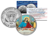 Here is your opportunity to own the JESUS CHRIST – LAST SUPPER collectible coin. This colorized JFK Kennedy Half Dollar U.S. Coin has been enhanced with a beautiful colorized image by the Merrick Mint. Each coin comes in a premium coin capsule with a full color Certificate of Authenticity to guarantee that your coin is authentic and recognized by every monetary authority around the world, assuring its Collector Edition status. This Legal Tender United States coin has been colorized with an application of special inks directly to the surface of the coin, using a unique and painstakingly multicolor coin process, which achieves a level of detail, color saturation, and durability that is #1 in the coin industry. The result is an everlasting colorized coin collectible of ultra-high quality. The Kennedy half dollar is a U.S. fifty cent coin with coin year and mint marks chosen at random.