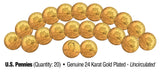 This fourth and final redesigned 2009 Lincoln penny was launched on November 12, 2009. The reverse design represents Lincoln's Presidency in Washington, DC from 1861 to 1865, and portrays the half-finished United States Capitol dome in Washington, DC. Here is your chance to own a lot of twenty (20) 24KT Gold Plated uncirculated 2009 Lincoln Bicentennial “Presidency” Pennies. Each genuine legal tender U.S. coin is 24KT Gold Plated by the Merrick Mint to highlight the original design using a unique authentic process. The result is an everlasting 24KT Gold Plated coin collectible of ultra-high quality that is #1 in the industry. Familiar President Lincoln bust design on the obverse.