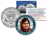 Here is your opportunity to own a beautifully colorized JFK Kennedy Half Dollar U.S. Coin featuring “MALALA YOUSAFZAI” in the “NOBEL PEACE PRIZE” coin series. Each coin comes in a premium coin capsule with a full color Certificate of Authenticity to guarantee that your coin is authentic and recognized by every monetary authority around the world, assuring its Collector Edition status. This Legal Tender United States coin has been colorized with an application of special inks directly to the surface of the coin, using a unique and painstakingly multicolor coin process, which achieves a level of detail, color saturation, and durability that is #1 in the coin industry. The result is an everlasting colorized coin collectible of ultra-high quality. The Kennedy half dollar is a U.S. fifty cent coin with coin year and mint marks chosen at random.