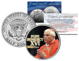 Here is your opportunity to own or to gift the “POPE BENEDICT XVI - 265th Pope” colorized JFK Kennedy Half Dollar U.S. Coin, which has been enhanced with a beautifully colorized image by the Merrick Mint. Each coin comes in a premium coin capsule with a full color Certificate of Authenticity to guarantee that your coin is authentic and recognized by every monetary authority around the world, assuring its Collector Edition status. This Legal Tender United States coin has been colorized with an application of special inks directly to the surface of the coin, using a unique and painstakingly multicolor coin process, which achieves a level of detail, color saturation, and durability that is #1 in the coin industry. The Kennedy half dollar is a U.S. fifty cent coin with coin year and mint marks chosen at random.