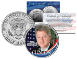 William Jefferson "Bill" Clinton was the 42nd President of the United States, serving from 1993 to 2001. Here is your opportunity to own or to gift the “BILL CLINTON – IN OFFICE 1993-2001” colorized JFK Kennedy Half Dollar U.S. Coin, which has been enhanced with a beautifully colorized image by the Merrick Mint. Each coin comes in a premium coin capsule with a full color Certificate of Authenticity to guarantee that your coin is authentic and recognized by every monetary authority around the world, assuring its Collector Edition status. This Legal Tender United States coin has been colorized with an application of special inks directly to the surface of the coin, using a unique and painstakingly multicolor coin process, which achieves a level of detail, color saturation, and durability that is #1 in the coin industry. The result is an everlasting colorized coin collectible of ultra-high quality. The Kennedy half dollar is a U.S. fifty cent coin with coin year and mint marks chosen at random.