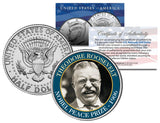 Here is your opportunity to own a beautifully colorized JFK Kennedy Half Dollar U.S. Coin featuring “THEODORE ROOSEVELT” in the “NOBEL PEACE PRIZE” coin series. Each coin comes in a premium coin capsule with a full color Certificate of Authenticity to guarantee that your coin is authentic and recognized by every monetary authority around the world, assuring its Collector Edition status. This Legal Tender United States coin has been colorized with an application of special inks directly to the surface of the coin, using a unique and painstakingly multicolor coin process, which achieves a level of detail, color saturation, and durability that is #1 in the coin industry. The result is an everlasting colorized coin collectible of ultra-high quality. The Kennedy half dollar is a U.S. fifty cent coin with coin year and mint marks chosen at random.