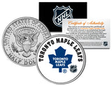 Here is your chance to own a JFK Kennedy Half Dollar U.S. coin that is beautifully colorized with the licensed NHL logo image of your favorite NHL team, the TORONTO MAPLE LEAFS. Each coin is officially licensed and approved by the National Hockey League (NHL). This high-quality genuine Legal Tender U.S. coin has been colorized using a unique painstaking multicolor authentic process by the Merrick Mint. Colorizing coins involves the unique application of special inks directly to the surface of a coin that achieves a level of detail, color saturation, and durability that is #1 in the coin industry. The result is an everlasting colorized coin collectible of ultra-high quality. Each uncirculated coin comes in a premium coin capsule with a NHL Certificate of Authenticity. The Kennedy half dollar is a U.S. fifty cent coin with coin year and mint marks chosen at random.