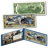 This WWII Multi-Iconic Images uncirculated $2 Bill is Genuine Authentic Legal Tender of the United States, which has been enhanced with beautiful colorized images. The full colorized images are accomplished through a revolutionary new authentic & genuine colorization process pioneered by The Merrick Mint. Included is a Certificate of Authenticity to guarantee that your bills are authentic and recognized by every monetary authority around the world, and assuring its Collector Edition status. Only genuine Legal Tender $2 United States Bills are used for this unique colorization process. Each $2 Bill is in FRESH, CRISP, UNCIRCULATED condition, and was directly removed from untouched wrapped Federal Reserve sealed packs. Former U.S. President Thomas Jefferson is featured on the obverse of the note, along with the special colorization overlay. The Signing of the Declaration of Independence by John Trumbull is featured on the reverse. It is the only U.S. Currency note that features two Presidents, John Adams and Thomas Jefferson, and it is one of the most rarely seen BILLS in circulation and actual use.